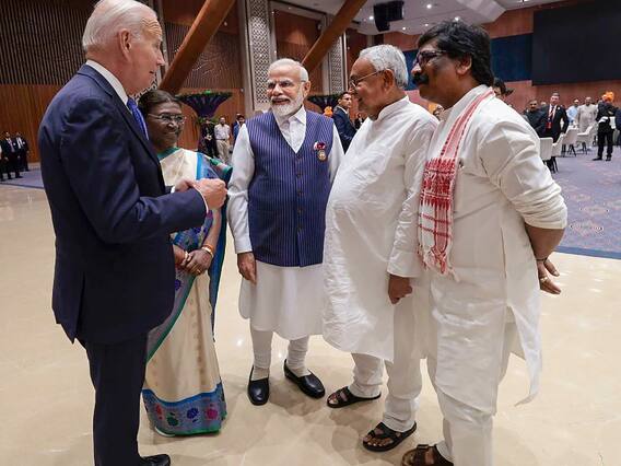 पटना: सीएम नीतीश कुमार (Nitish Kumar) और प्रधानमंत्री नरेंद्र मोदी (PM Narendra Modi) के बीच जी20 शिखर सम्मेलन (G20 Summit 2023) के रात्रिभोज के दौरान शनिवार को मुलाकात हुई. इसके साथ ही इस रात्रिभोज के दौरान सीएम नीतीश कुमार की एक तस्वीर की खूब चर्चा हो रही है. इस तस्वीर में नीतीश कुमार भारत की राष्ट्रपति द्रौपदी मुर्मू (President Draupadi Murmu), प्रधानमंत्री नरेंद्र मोदी और अमरीका के राष्ट्रपति बाइडेन (President Biden) के साथ दिख रहे हैं. झारखंड के सीएम हेमंत सोरेन (Hemant Soren) भी साथ में दिख रहे हैं. मुख्यमंत्री नीतीश कुमार सभी से बात कर रहे हैं और सभी इसमें खुश नजर आ रहे हैं. बता दें कि पीएम मोदी और सीएम नीतीश के बीच करीब 18 महीनों के बाद मुलाकात हुई है.