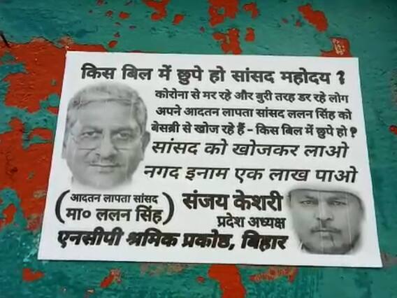 पोस्टर को शहर के कई चौक, सदर अस्पताल के मुख्य द्वार और सरकारी कार्यालय की दीवारों पर लगाया गया है. उसमें लिखा है “सांसद ललन सिंह को खोजकर लाओ एक लाख नकद पाओ. मुंगेर संसदीय क्षेत्र के लोग कोरोना संक्रमण से मर रहे हैं. लोग संक्रमण से बुरी तरह से डर रहे हैं लेकिन इस भीषण आपदा कोरोना महामारी के बीच लापता सांसद ललन सिंह ना जाने किस बिल में छुपे हैं.”