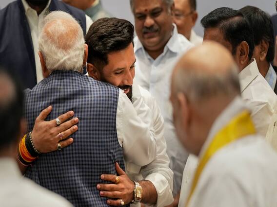 पटना: एनडीए की बैठक (NDA Meeting) मंगलवार को नई दिल्ली में शुरू हो गई है. इस दौरान पीएम नरेंद्र मोदी (Narendra Modi) ने एनडीए (NDA) के घटक दल के नेताओं से मुलाकात की. नेताओं से मुलाकात के दौरान पीएम नरेंद्र मोदी ने अपने 'हनुमान' एलजेपी रामविलास के राष्ट्रीय अध्यक्ष चिराग पासवान (Chirag Paswan) को गले लगाया. चिराग ने पीएम मोदी के पांव छुए. इस पल की हर तरफ चर्चा हो रही है. पीएम मोदी के प्रति चिराग पासवान की वफादारी जगजाहिर है. 2014 लोकसभा चुनाव में चिराग की ही सलाह पर रामविलास पासवान ने एनडीए के साथ गठबंधन किया था. इसके बाद से ही चिराग पासवान हमेशा पीएम मोदी के साथ रहे हैं. चिराग एनडीए गठबंधन में रहे या नहीं रहे, लेकिन बीजेपी (BJP) का समर्थन करते रहे हैं. पीएम मोदी ने चिराग को गले लगाकर महागठबंधन को साफ संदेश दे दिया कि बिहार के लिए चिराग क्या मायने रखते हैं और चिराग पीएम मोदी के लिए कितना महत्वपूर्ण हैं.