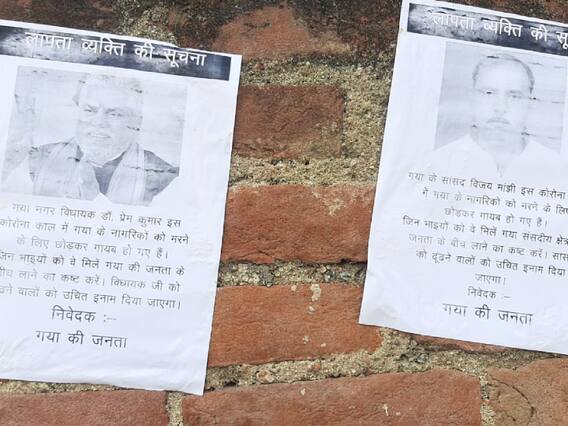 शहर के गेवालबीघा पुलिस लाइन मोहल्ले में जगह-जगह सांसद विजय कुमार और नगर विधायक डॉ. प्रेम कुमार के गुमशुदा की तलाश वाला पोस्टर लगाया गया है. पोस्टर में लिखा है कि इस कोरोनाकाल में गया के नागरिकों को मरने के लिए छोड़ कर चले गए हैं. जिन भाइयों को मिलें ये तो गया की जनता के बीच लाने का कष्ट करें. ढूंढने वालों को इनाम दिया जाएगा.