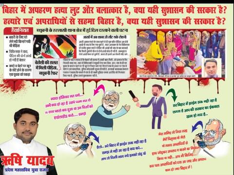पोस्टर पर एक तस्वीर यह भी दिखाई गई है जिसमें मुख्यमंत्री फोन पर राज्य सभा सांसद और पूर्व उपमुख्यमंत्री सुशील कुमार मोदी से कह रहे हैं..... हेलो अरे बिहार में क्राइम रुक नहीं रहा है, समझ में नहीं आ रहा है क्या करूं. आप तो दिल्ली भाग गए हमको छोड़कर. तो वहीं दूसरी तस्वीर में सुशील कुमार मोदी जवाब देते नजर आ रहे हैं कि मेरी मानिए तो जिस तरह से मैंने पितृपक्ष के मेले के समय अपराधियों के हाथ जोड़कर अपराध नही करने का निवेदन किया था आप भी कीजिए क्या पता अपराधियों को दया आ जाए और अपराध कम हो जाए बिहार में.