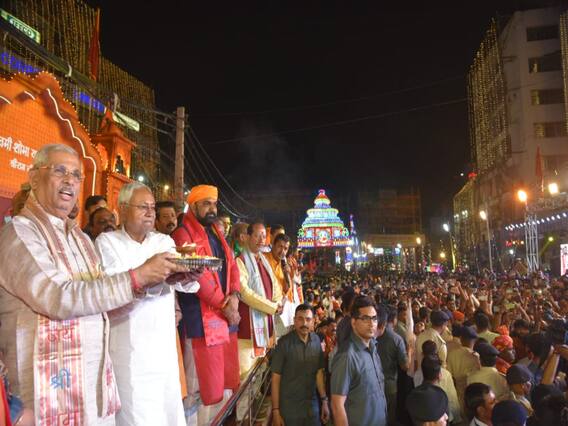 पटना: राज्यपाल राजेन्द्र विश्वनाथ आर्लेकर (Rajendra Vishwanath Arlekar) और मुख्यमंत्री नीतीश कुमार (Nitish Kumar) ने आज शाम रामनवमी (Ram Navami) के अवसर पर पटना के डाकबंगला चौराहा पहुंचकर रामनवमी शोभा यात्रा अभिनन्दन समिति द्वारा आयोजित कार्यक्रम में भाग लिया. राज्यपाल और मुख्यमंत्री ने शोभा यात्रा का स्वागत कर आरती की तथा उन्हें प्रतीक चिह्न भेंटकर सम्मानित किया. मुख्यमंत्री नीतीश कुमार ने इस दौरान रामनवमी की शुभकामनाएं राज्यवासियों को दीं.