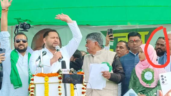 सीवान: पूर्व उपमुख्यमंत्री तेजस्वी यादव (Tejashwi Yadav) जन विश्वास यात्रा (Jan Vishwas Yatra) के तहत गुरुवार (22 फरवरी) को सीवान पहुंचे. सीवान में उन्होंने सभा की. इस दौरान सोशल मीडिया पर उनकी एक तस्वीर वायरल हो गई. तस्वीर में तेजस्वी यादव भाषण देते दिख रहे हैं तो वहीं मंच पर एक शार्प शूटर मोहम्मद कैफ उर्फ बंटी भी दिख रहा है. तस्वीर सामने आने के बाद बीजेपी भी भड़क गई.