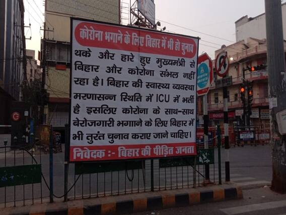 पोस्टर में लिखा गया है, “ कोरोना भगाने के लिए बिहार में भी हो चुनाव. थके और हारे हुए मुख्यमंत्री से बिहार और कोरोना संभल नहीं रहा है. बिहार की स्वास्थ्य व्यवस्था मरणासन्न स्थिति में ICU में भर्ती है. इसलिए कोरोना के साथ-साथ बेरोजगारी भगाने के लिए बिहार में भी तुरंत चुनाव कराए जाने चाहिए. निवेदक - बिहार की पीड़ित जनता.”