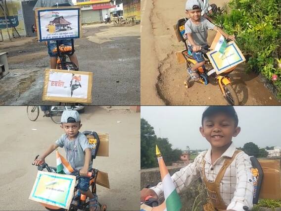 अपनी छोटी साइकिल में तख्ती लगाकर कर रहे हैं लोगों को जागरूकभोज कुमार साहू के चार साल के नन्हे पुत्र वृक्षांश (कनिष्क) लोगों को जागरूक करने के लिए अपनी छोटी सी साईकिल पर 'हर घर तिरंगा' का स्लोगन लिखा हुआ तख्ती व तिरंगा लगाकर नगर में भ्रमण कर रहे हैं. वृक्षांश को देखकर लोग बिना तख्ती पढ़े आगे नही बढ़ रहें हैं. साथ ही प्रत्येक दिन अपने स्कूल ड्रेस में तिरंगा बना हुआ बैच लगाकर अपने दोस्तों को भी हर घर तिरंगा अभियान को सफल बनाने के लिए अपील कर रहे हैं.