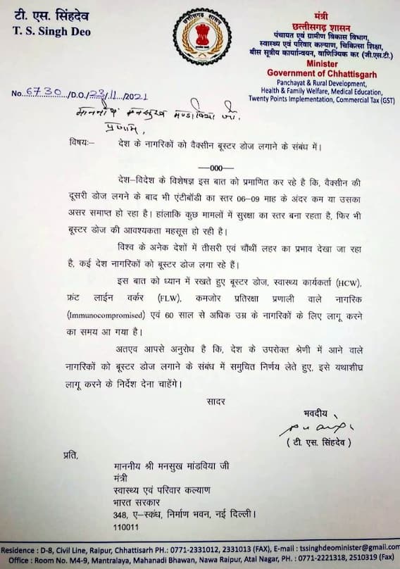स्वास्थ्य मंत्री टी एस सिंहदेव ने अपने पत्र में आगे लिखा है कि विश्व के अनेक देशों में तीसरी व चौथी लहर का प्रभाव देखा जा रहा है, इसके साथ ही कई देश नागरिकों को बूस्टर डोज़ भी लगा रहे हैं. इस विषय को ध्यान में रखते हुए स्वास्थ्य कार्यकर्ता, फ्रंट लाइन वर्कर, कमजोर प्रतिरक्षा प्रणाली वाले नागरिक, फ्रंट लाईन एवं 60 साल से अधिक उम्र के नागरिकों के लिए लागू करने का समय आ गया है.