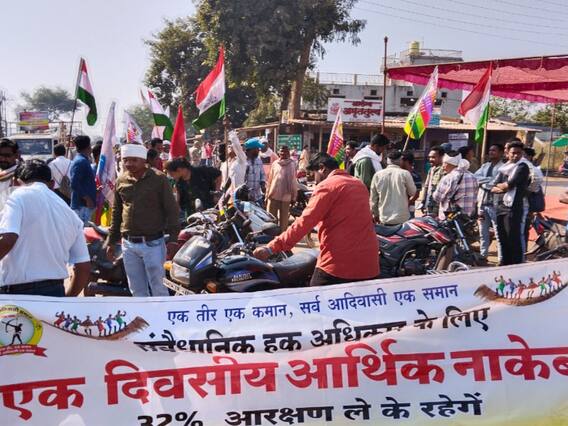 Tribal reservation: छत्तीसगढ़ में आरक्षण (Reservation) का मुद्दा लगातार जोर पकड़ता जा रहा है. 32 में से 12% आरक्षण कम करने के विरोध में आदिवासी समाज (Tribal Society) सड़कों पर उतर आया है. आरक्षण को लेकर सर्व आदिवासी समाज ने आज छत्तीसगढ़ में एक दिवसीय धरना प्रदर्शन किया. धरना प्रदर्शन के चलते आदिवासी समाज के लोगों ने छत्तीसगढ़ (Chhattisgarh) के कई जिलों में सड़क मार्ग पर चक्का जाम कर दिया. वहीं बालोद (Balod) में रेल की पटरियों पर बैठकर प्रदर्शन किया.