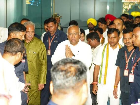 Chhattisgarh Election 2023: छत्तीसगढ़ में विधानसभा चुनाव के साथ कांग्रेस पार्टी लोकसभा चुनाव (Loksabha Election) की तैयारी में भी जुट गई है. इसके अलावा विधानसभा चुनाव के लिए कांग्रेस पार्टी ने अपनी चुनावी अभियान भी तेज कर दी है. राहुल गांधी (Rahul Gandhi) ने 2 सितंबर को रायपुर में एक विशाल सभा को संबोधित किया है. इसके 5 दिन बाद 8 सितंबर को कांग्रेस के राष्ट्रीय अध्यक्ष मल्लिकार्जुन खरगे (Mallikarjun kharge) दुर्ग संभाग के राजनांदगांव जिले में भरोसे के सम्मेलन में शामिल होने वाले हैं. सम्मेलन के एक रात पहले ही मल्लिकार्जुन खरगे रायपुर पहुंच गए हैं. रायपुर एयरपोर्ट में मुख्यमंत्री भूपेश बघेल समेत सैकड़ों कांग्रेसी नेताओं ने स्वागत किया है.