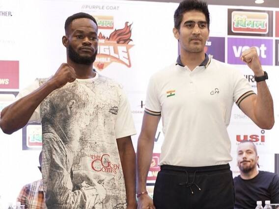 The Jungle Rumble: छत्तीसगढ़ (Chhattisgarh) की राजधानी रायपुर (Raupur) अपनी पहली प्रोफेशनल बॉक्सिंग मैच के लिए तैयार है. पेशेवर भारतीय मुक्केबाज विजेन्द्र सिंह (Indian boxer Vijender Singh) का मुकाबला 'द जंगल रंबल' में घाना के मुक्केबाज एलियासु सुले (Eliasu Sule) से होगा. यह मुकाबला रायपुर के बलबीर सिंह जुनेजा स्टेडियम में बुधवार शाम 6:30 बजे से शुरू हो जाएगा. देश भर में इस मैच को देखा जा सकता है. इसका प्रसारण स्पोर्ट्स चैनलों पर किया जाएगा.