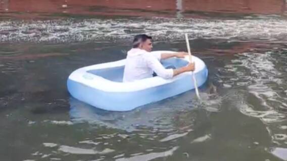 आम आदमी पार्टी के नेता और पूर्व पार्षद मनोज त्यागी ने नाव चलाकर दिल्ली की सरकार को जगाने का प्रयास किया. उत्तर पूर्वी दिल्ली के खजूरी खास थाने की सड़क पर कई दिनों से पानी जमा है और लोग गंदे पानी में होकर आने-जाने को मजबूर हैं. आप नेता ने कहा कि लोगों की कई शिकायतों के बाद भी बीजेपी सरकार नींद से नहीं जागी.
