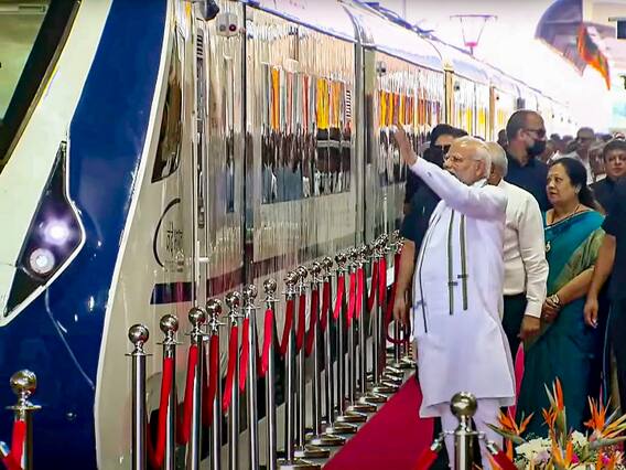 PM Modi in Gujarat: प्रधानमंत्री नरेंद्र मोदी अपने दो दिवसीय दौरे को लेकर गुजरात में हैं. प्रधानमंत्री मोदी ने आज गांधीनगर और मुंबई के बीच वंदे भारत एक्सप्रेस ट्रेन को हरी झंडी दिखाई है. इस बीच प्रधानमंत्री मोदी रेलवे कर्मचारियों से बातचीत करते नजर आये. प्रधानमंत्री कार्यालय से मिली जानकारी के मुताबिक, प्रधानमंत्री नरेंद्र मोदी ने गांधीनगर से कालूपुर रेलवे स्टेशन तक ट्रेन में यात्रा की. इस यात्रा में उनके साथ जीवन से आए विभिन्न क्षेत्रों के लोग, जिनमें रेलवे परिवार के लोग, महिला उद्यमी और युवा भी शामिल हैं.