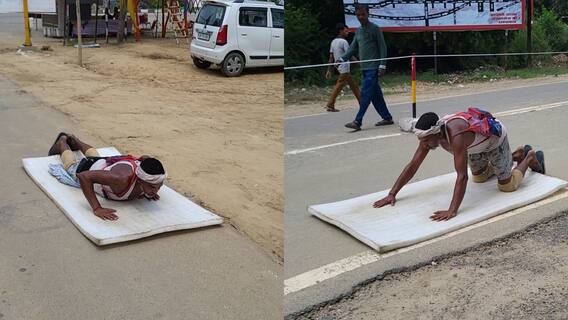 वह यात्रा में सबसे पहले एक गड्ढे नुमा प्लास्टिक का टुकड़ा साथ लिए हैं, जिसे पहले पृथ्वी पर बिछाते हैं और फिर उसके ऊपर लेट कर अपनी यात्रा पूरी करते हैं. फिर अगले कदम के लिए वही प्लास्टिक का टुकड़ा आगे बढ़ा देते हैं.