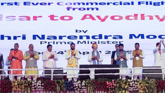PM Modi Flags Off Hisar Ayodhya Flight: पीएम नरेंद्र मोदी ने सोमवार (14 अप्रैल) को हिसार से अयोध्या के लिए कमर्शियल उड़ान को हरी झंडी दिखाई और एयरपोर्ट पर नए टर्मिनल भवन के लिए आधारशिला रखी. हवाई यात्रा को सुरक्षित, किफायती और सभी के लिए सुलभ बनाने की प्रतिबद्धता के अनुरूप प्रधानमंत्री मोदी ने महाराजा अग्रसेन हवाई अड्डे के नए टर्मिनल भवन के लिए आधारशिला रखी.