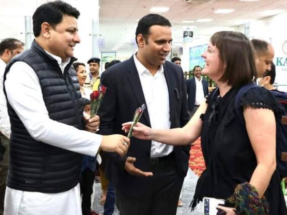 जी-20 के सम्मेलन के लिए 20 देशों के प्रतिनिधि धर्मशाला पहुंचे. वहीं 20 देशों के 60 प्रतिनिधियों का गग्गल हवाई अड्डे पर जोरदार स्वागत हुआ. यहां विदेशी मेहमानों ने हिमाचली कलाकारों के साथ नाटी भी डाली. विदेशी मेहमानों की अगवानी हिमाचल पर्यटन विकास निगम के अध्यक्ष आर एस बाली ने की. इस दौरान लोकसभा सांसद किशन कपूर, राज्यसभा सांसद इंदु गोस्वामी, धर्मशाला के विधायक सुधीर शर्मा, सुलह के विधायक विपिन सिंह परमार और जिला प्रशासन के अधिकारी एयरपोर्ट पर मौजूद रहे. दो दिन तक चलने वाली इस बैठक में रिसर्च एंड इन्नोवेशन इंस्टीट्यूट गैलरी पर चर्चा होनी है.