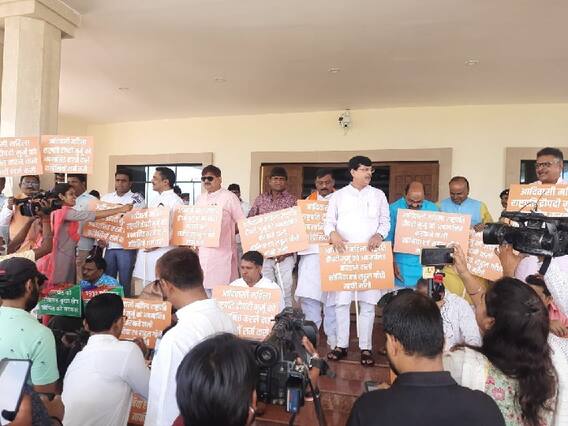 Jharkhand Assembly Monsoon Session BJP MLA Protest: झारखंड विधानसभा (Jharkhand Assembly) के मानसून सत्र (Monsoon Session) के पहले ही दिन शुक्रवार को भारतीय जनता पार्टी के विधायकों ने राष्ट्रपति द्रौपदी मुर्मू (President Draupadi Murmu) पर कांग्रेस (Congress) नेता अधीर रंजन चौधरी (Adhir Ranjan Chowdhury) की टिप्पणी को लेकर जोरदार प्रदर्शन किया. बीजेपी विधायकों ने इस मसले पर सोनिया गांधी (Sonia Gandhi) और राहुल गांधी (Rahul Gandhi) से माफी की मांग की है. सत्र शुरू होने के ठीक पहले बीजेपी विधायकों का समूह विधानसभा के मुख्य द्वार पर तख्तियां लेकर बैठ गया. तख्तियों पर आदिवासी बेटी का अपमान नहीं सहेगा हिंदुस्तान, सोनिया-राहुल माफी मांगों जैसे नारे लिखे थे.