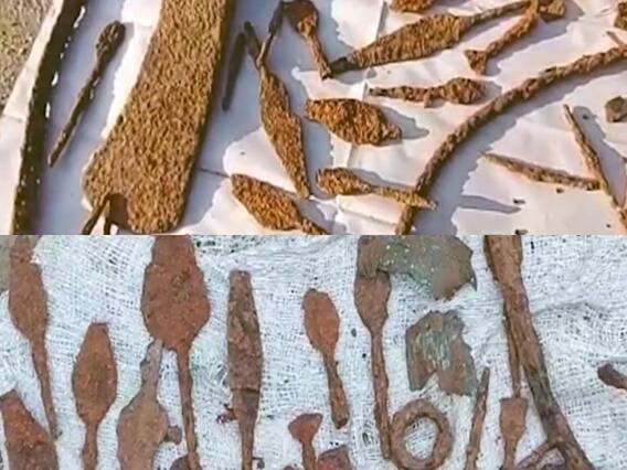 10 साल पहले भी मिले थे हथियारग्रामीणों की मानें तो करीब 10 साल पहले जब इस स्थान पर सड़क बनाई जा रही थी, तब भी जमीन की खुदाई के दौरान इस तरह के हथियार और अन्य अवशेष मिले थे. लेकिन ग्रामीणों ने ही इन्हें इधर-उधर कर दिया था. वहीं अब मिले अवशेष ने लोगों की उत्सुकता बढ़ा दी है.