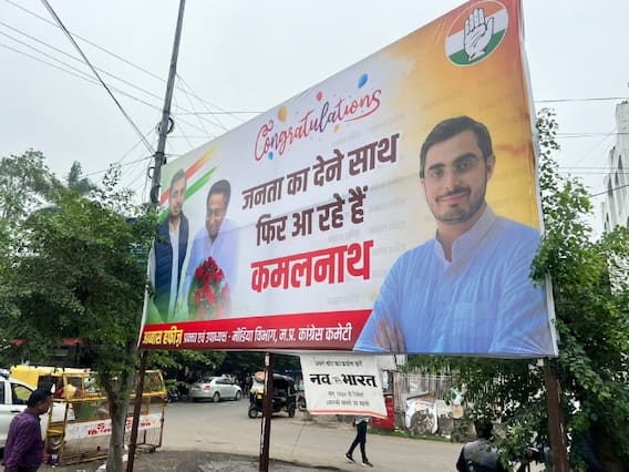 दरअसल, भोपाल में कांग्रेस कार्यलय के बाहर एक पोस्टर चस्पा किया गया है, जिसमें कांग्रेस कार्यकर्ता द्वारा कमलनाथ को बधाई को बधाई दी गई है. इतना ही नहीं पोस्टर में उन्हें प्रदेश के अगले सीएम के रूप में दर्शाया गया है. भोपाल में कांग्रेस कार्यलय के बाहर जो पोस्टर चस्पा किया गया है, उसमें लिखा है "जनता का साथ देने फिर आ रहे हैं कमलनाथ." उल्लेखनीय है कि एमपी कांग्रेस के बड़े नेता भी लगातार अपनी पार्टी की सरकार बनने का दावा कर हैं.