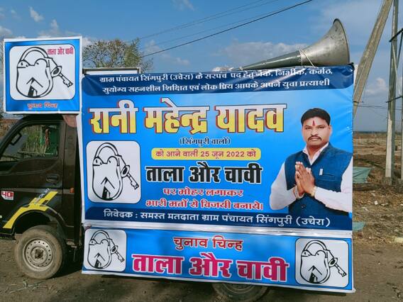 महिला उम्मीदवार के चुनाव प्रचार के लिए एक बैनर बनवाया गया. बैनर में चुनाव चिन्ह है, उसके पति की फोटो है, मतदाताओं से जिताने की अपील की गई है लेकिन असल उम्मीदवार की तस्वीर नदारद है. सवाल पूछे जाने पर महिला उम्मीदवार के पति महेंद्र यादव ने बताया कि वह सरपंच पद का चुनाव लड़ना चाहता था लेकिन महिला सीट रिजर्व होने से पत्नी को मैदान में उतार दिया.