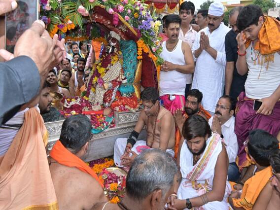 Mahakal Sawari Update: श्रावण के पंचम सोमवार पर भगवान श्री महाकालेश्वर पालकी में श्री चन्द्रमौलेश्वर, हाथी पर श्री मनमहेश, गरूड़ रथ पर शिवतांडव और नन्दी रथ पर उमा-महेश, डोल रथ पर होल्कर स्टेट के मुखारविंद विराजित होकर अपनी प्रजा का हाल जानने नगर भ्रमण पर निकले. सवारी के निकलने के पूर्व सभामंडप में सर्व प्रथम भगवान श्री चन्द्रमौलेश्वर का षोडशोपचार से पूजन-अर्चन किया गया. इसके पश्चात भगवान की आरती की गई. पूजन-अर्चन मुख्य पुजारी पं. घनश्याम शर्मा द्वारा संपन्न कराया गया.
