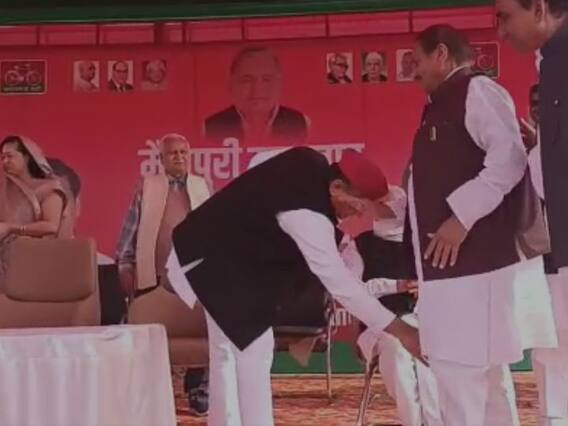 जसवंतनगर में आयोजित एक रैली के दौरान कार्यकर्ताओं से मिलने के बाद मंच पर अखिलेश यादव पहुंचते हैं. इसके थोड़ी ही देर बाद शिवपाल यादव भी मंच पहुंचते हैं. चाचा के आते ही अखिलेश तुरंत उनके पैर छूते हैं.