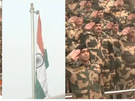 BSF 74th Republic Day celebration on Attari Wagah Border Punjab: गुरुवार को बीएसएफ के जवानों ने भारत का राष्ट्रीय ध्वज तिरंगा पंजाब की अटारी सीमा पर फहराया. इस दौरान राष्ट्रगान भी बजाया गया. हवा में लहराते तिरंगे को देखकर सभी का सिर गर्व से ऊंचा हो गया. बता दें कि 74वें गणतंत्र दिवस के अवसर पर डीआईजी बीएसएफ संजय गौड़ के नेतृत्व में अटारी-वाघा सीमा पर राष्ट्रीय ध्वज फहराया गया.