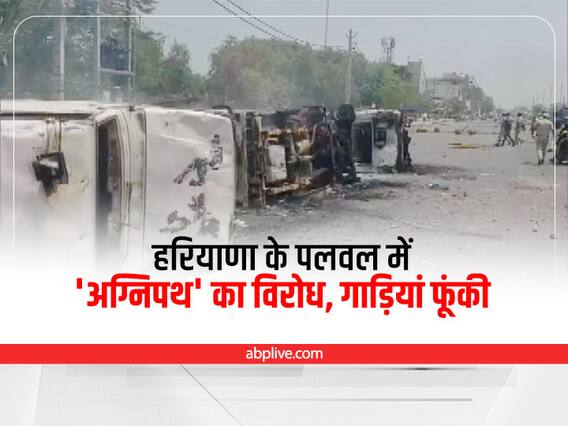 Agnipath Scheme Protest in Palwal: अग्निपथ योजना को लेकर देश के कई राज्यों में युवाओं का विरोध प्रदर्शन बढ़ता जा रहा है. हरियाणा के पलवल में विरोध कर रहे प्रदर्शनकारियों ने जमकर तोड़फोड़ की और कुछ वाहनों को आग के हवाले कर दिए. वहीं डीसी आवास पर तैनात पुलिसकर्मियों ने अग्निपथ योजना के विरोध में आवास पर पथराव कर रहे प्रदर्शनकारियों को चेतावनी देते हुए हवाई फायरिंग की. डीसी आवास के पास में विरोध के कारण कुछ पुलिसकर्मी घायल हुए और प्रदर्शनकारियों ने पुलिस वाहनों में तोड़फोड़ की है.