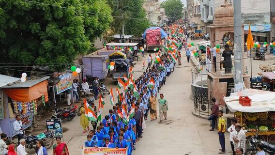 Rajasthan News: भीलवाड़ा में 'हर घर तिरंगा अभियान‘ के तहत रैली का आयोजन हुआ. आसींद उपखंड मुख्यालय पर 4 किलोमीटर लंबी तिरंगा रैली निकाली गयी. राजकीय विद्यालय के छात्रों की तिरंगा रैली को हरी झंडी पालिका अध्यक्ष देवीलाल साहू, उपाचार्य बालमुकुंद वैष्णव ने बस स्टैंड पर हरी झंडी दिखाई. विभिन्न सामाजिक संगठनों और कारोबारियों ने पुष्प वर्षा कर तिरंगा रैली का स्वागत किया. महावीर कामधेनु गौशाला ने तिरंगा रैली में शामिल छात्र-छात्राओं के लिए शरबत और पेयजल की व्यवस्था की थी.