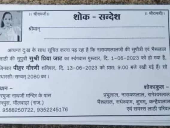 Bhilwara News: राजस्थान के भीलवाड़ा से एक हैरान करने वाला मामला सामने आ रहा है, जहां एक पिता ने अपनी जीवित बेटी का मत्यु भोज रख दिया और शोक संदेश भी छपवाकर गांव भर में बांटा. मामला जिले के मंगरोप थाना क्षेत्र का है. जानकारी के अनुसार, बेटी ने घर से भागकर शादी कर ली थी. माता-पिता उसे समझाने भी गए थे, लेकिन वह मानने को राजी नहीं हुई. इसके बाद गुस्साए मां-बाप ने भी बेटी को मृत मान लिया और मृत्यु भोज पियर गोरणी का कार्यक्रम रखा.