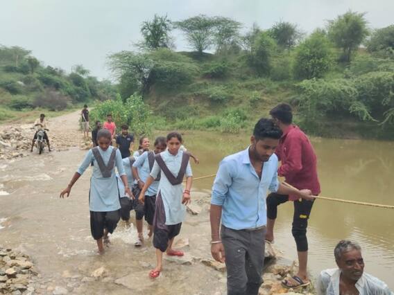 भीलवाड़ा से सुरेंद्र सागर की रिपोर्ट: पढ़ाई बच्चों का बुनियादी हक है. पढ़ने का जज्बा इतना की जान जोखिम में डालकर भी रस्सी के सहारे बहते हुए पानी को पार कर स्कूल जाते हैं. नौनिहाल बच्चे अपना भविष्य सवार रहे हैं. देशभर में एक तरफ जहां सरकार बच्चों को अच्छी शिक्षा और सड़कें भी प्रदान करने का वादा करती हैं, वहीं दूसरी तरफ हर रोज़ कई ऐसी खबरें सामने आती है जो इस पर सवालिया निशान खड़ी कर देती हैं. ऐसा ही एक मामला कोटड़ी उपखंड क्षेत्र के घेवरिया गांव से सामने आया है जहां पर बारिश के समय के दौरान गांव के 35 बच्चे स्कूल जाने के लिए अपनी जान जोखिम में डालकर रस्सी के सहारे खाल को पार करते हैं.