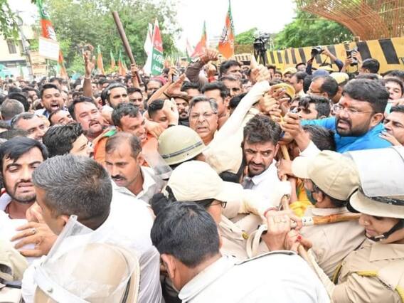 दरअसल, भाजपाई जयपुर में शहीद स्मारक पर जमा हुए थे और उसके बाद सीएम हाउस घेरने जा रहे थे. इसमें कुछ नेताओं को हल्की चोटें भी लगी है. गिरफ्तार किए गए लोगों में सांसद राज्यवर्धन सिंह, भाजपा प्रदेश अध्यक्ष सतीश पूनिया, गुलाब चंद कटारिया, अशोक लाहोटी, रामलाल शर्मा, निर्मल कुमावत समेत अन्य नेता शामिल हैं. बीजेपी के प्रदर्शन के दौरान कुछ कार्यकर्ता हिंसक हो गए और पुलिस द्वारा लगाए गए बैरिकेट के ऊपर चढ़ गए. पुलिस ने कार्यकर्ताओं को रोकने के लिए हल्का बल प्रयोग किया. इस दौरान कार्यकर्ता हर-हर महादेव के नारे लगाते दिखे.