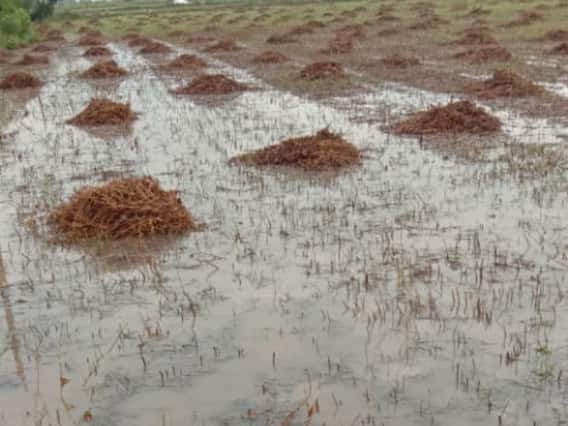 बेमौसम बारिश के कारण खेतों में तैयार फसल पानी में डूब गई