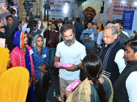 सेनेटरी नैपकिन से मिल रहा रोजगारराहुल गांधी ने अशोक गहलोत के साथ प्रदर्शनी में इंदिरा गांधी शहरी रोजगार गारंटी योजना, राजीविका और उड़ान योजना के लाभार्थियों से बातचीत की. विभागीय अधिकारी ने बताया कि राजस्थान में 10 से 45 साल तक की लड़कियों और महिलाओं को सेनेटरी नेपकिन मुफ्त बांटी जा रही है. राहुल गांधी ने सेनेटरी नैपकिन हाथ में लेकर उसकी क्वालिटी और क्वांटिटी के बारे में जानकारी ली और नैपकिन बनने की प्रक्रिया भी पूछी. उन्होंने कहा कि यह स्वयं सहायता समूह से ही बनवाया जाए, ताकि महिलाओं को रोजगार मिले और उनकी इनकम हो. लाभार्थी महिलाओं ने बताया कि उन्हें इन योजनाओं के जरिए रोजगार मिलने से आर्थिक संबल मिला है. वहीं निःशुल्क सेनेटरी नैपकिन मिलने से उनका स्वास्थ्य प्रबंधन बेहतर हुआ है.