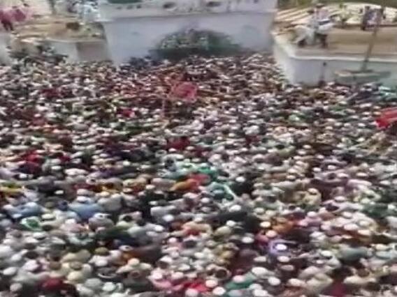 बदायूं. उत्तर प्रदेश के बदायूं जिले में एक मुस्लिम धर्मगुरु हजरत अब्दुल हमीद मोहम्मद सालिमुल कादरी का इंतकाल हो गया. उनके इंतकाल के बाद हजारों की संख्या में लोग जनाजे में शामिल हुए. इस दौरान लोगों ने कोविड नियमों की जमकर धज्जियां उड़ाई. जनाजे में शामिल कई लोग बिना मास्क के भी थे. पुलिस ने इस मामले में अज्ञात लोगों के खिलाफ केस दर्ज कर लिया है.