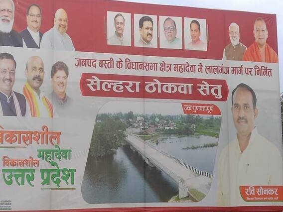 MLA Ravi Sonkar Gets Trolled: यूपी के बस्ती जिले में एक दावे को लेकर बीजेपी विधायक रवि सोनकर जमकर ट्रोल हो रहे हैं. बीजेपी विधायक का दावा जिले में चर्चा का विषय बन गया है. दरअसल, बस्ती के महादेवा में लालगंज मार्ग पर सेल्हरा ठोकवा पुल निर्माण का दावा किया जा रहा है. बाकायदा होर्डिंग लगवाकर इस हवा-हवाई पुल का प्रचार भी कर दिया गया. चौराहे पर लगे विधायक जी के पोस्टरों को जब विधानसभा की जनता ने देखा तो बीजेपी विधायक के खिलाफ तमाम तरह की चर्चाएं शुरू हो गई. इतना ही नहीं विधायक जी के हवा-हवाई पुल का फोटो सोशल मीडिया पर जमकर वायरल हो गया.