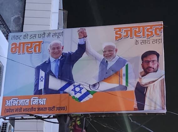 ये पोस्टर बीजेपी के प्रदेश मंत्री अभिजात मिश्रा की ओर से लगाए गए हैं. इन पर प्रधानमंत्री नरेंद्र मोदी और इजराइल के प्राइम मिनिस्टर बेंजामिन नेतन्याहू की तस्वीर है, जिसमें दोनों नेता एक दूसरे का हाथ पकड़े हुए अपने मजबूत रिश्तों का संदेश दे रहे हैं. इस पोस्टर पर ऊपर की ओर लिखा है संकट की इस घड़ी में संपूर्ण भारत उनके साथ है.