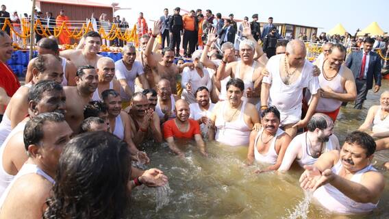 सीएम योगी आदित्यनाथ ने जब गंगा में डुबकी लगाई तो उनके साथ उपमुख्यमंत्री केशव प्रसाद मौर्य, डिप्टी सीएम ब्रजेश पाठक, मंत्री स्वतंत्र देव सिंह, मंत्री नंद गोपाल गुप्ता नंदी और मंत्री जयवीर सिंह समेत कई मंत्री थे.
