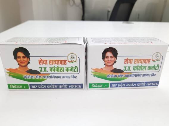 मेडिकल किट में प्रियंका गांधी की तस्वीर लगाई गई है