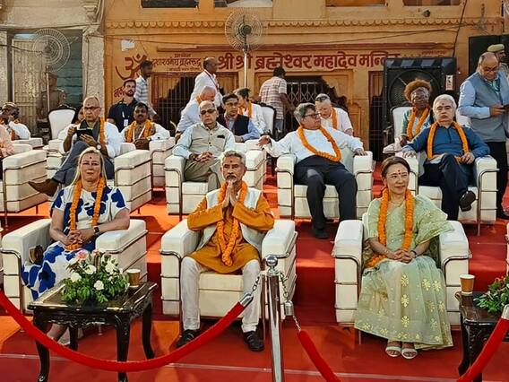 UP News: काशी में जी-20 सदस्यों के विकासमंत्रियों की हो रही बैठक में हिस्सा लेने आए विदेशी प्रतिनिधि रविवार शाम को गंगा आरती में शामिल हुए. काशी आये विदेशी मेहमान दशाश्वमेध घाट पर आयोजित गंगा आरती में शामिल हुए और शंखनाद, घंटी, डमरू की आवाज और मां गंगा के जयकारों के बीच हुई गंगा आरती को देखा. विदेशी मेहमानों के लिए विशेष आरती का आयोजन किया गया और नौ अर्चकों ने मां गंगा की आरती उतारी.
