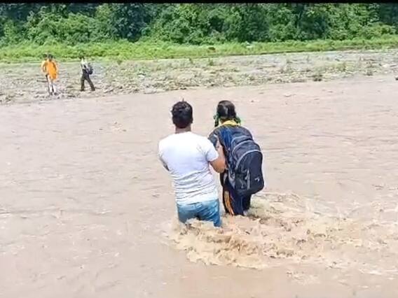 पहाड़ों पर हो रही बारिश की वजह से सूखी नदी में इन दिनों उफान पर बह रही है. नदी में पानी आ जाने की वजह से यहां विजयपुर गांव का संपर्क ही कट गया है ऐसे में ग्रामीण जान जोखिम में डालकर इस नदी को पार कर रहे हैं. हैरानी की बात है कि सिर्फ गांववाले ही नहीं स्कूली बच्चे भी कमर तक भरे इस पानी में घुसकर नदी को पार कर रहे हैं. बच्चों को सबसे ज्यादा परेशानी उठानी पड़ रही है. पानी की धारा इतनी तेज है कि वो बड़ों की मदद से पानी में घुसकर नदी पार कर रहे हैें. ऐसे में अगर कोई बुजुर्ग बीमार हो जाता है तो उन्हें भी इसी तरह कंधे पर बिठाकर ले जाना पड़ता है.