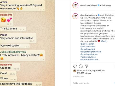 दीपिका ने इस फोटो को कैप्शन दिया, "और यह है कि जब भी परिवार में किसी का कुछ खास या अहम दिन होता है, तो बाकी हम सभी इस तरह बात करते हैं। ऊपर दिए गए मामले में सभी ने मेरे पति द्वारा हाल ही में दिए एक इंटरव्यू की सराहना की है।" उन्होंने साझा किया कि कई बार उन्हें और रणवीर को बेहतर प्रदर्शन करने के लिए कहा जाता है।