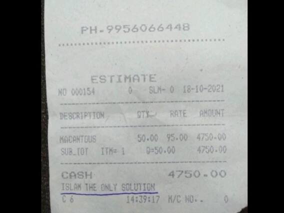 आप जब दुकान से कोई सामान खरीदते हैं तो दुकानदार आपको बिल देता है. कानपुर में एक दुकानदार पर आरोप है कि वो बिल की पर्ची में जेहादी भाषा का इस्तेमाल कर रहा है. यहां के मेस्टन रोड में स्थित रबड़ कारोबारी की दुकान की पर्ची में व्यापारिक प्रतिष्ठान की जगह पर व्यापारी का मोबाइल नम्बर लिखा हुआ है. इसके नीचे बड़े बड़े अक्षरों में लिखा गया है "इस्लाम द ओनली सॉल्यूशन" यानी इस्लाम ही एक मात्र समाधान है. रबड़ कारोबारी की यह पर्ची सोशल मीडिया में तेजी से वायरल हो रही है. पर्ची वायरल होने के बाद कानपुर कमिश्नरेट पुलिस हरकत में आ गयी.