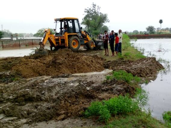 नहर के पानी को रोकने के लिए ली जा रही जेसीबी की मदद