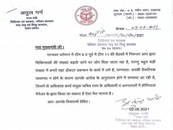स्वास्थ्य राज्य मंत्री अतुल गर्ग ने सीएम को लिखा था पत्र 5 जून को टीम 9 की बैठक में सीएम योगी ने निर्देश दिए थे कि चिकित्सकों को केवल चिकित्सकीय कार्य में ही तैनात किया जाए. स्वास्थ्य विभाग और चिकित्सा शिक्षा विभाग के अलग-अलग अस्पतालों, कार्यालयों सहित जहां भी चिकित्सकों की तैनाती प्रशासनिक या प्रबंधकीय कार्यों में की गई है, उन्हें तत्काल कार्यमुक्त कर चिकित्सकीय कार्यों में ही लगाया जाए. प्रबंधन के कार्यों के लिए आवश्यकतानुसार एमबीए उपाधिधारक युवाओं को मौका दिया जाना चाहिए. इस मीटिंग से पहले 2 जून को स्वास्थ्य राज्य मंत्री अतुल गर्ग ने सीएम को एक पत्र लिखा था. इसमें कहा गया था कि बड़ी संख्या में डॉक्टर्स प्रबंधकीय कार्यों में लगे हैं. इसकी वजह से भी चिकित्सकों की कमी है.