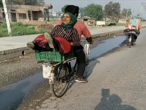 लॉकडाउन में वाराणसी के ग्रामीण क्षेत्रों की ओर से मजदूरों के पलायन की अलग-अलग तस्वीर सामने आ रही है। मिर्जामुराद क्षेत्र में जब साइकिल पर सवार होकर जा रहे एक सख्श पर जब सबकी नजर पड़ी तो बस वहीं ठहरकर रह गयी । साइकिल चलाने वाला शेर सिंह पटना से अपनी मां को लेकर चला है और इसे नेपाल जाना है, शेर सिंह ने बताया कि नेपाल सीमा सील होने के कारण वो बनारस प्रतापगढ़,गोंडा बहराइच होते हुए नेपाल जाना चाहता है तेज धूप में मां को पीछे बैठकर मीलों साइकिल चलाने में थकान तो होती है लेकिन बीच बीच में रुक रुक कर पानी पीते और मां की सेवा करते आगे बढ़ते है शेर सिंह की माने तो मां के आशीर्वाद से जल्द ही नेपाल पहुंच जाएंगे।