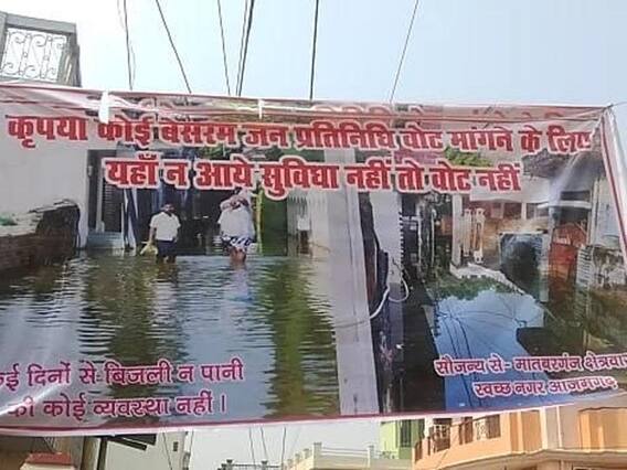 Water logging in Azamgarh: आजमगढ़ जिले की कई कॉलोनी के लोग जलजमाव की समस्या से परेशान हैं. आलम ये है के लोगों ने सुविधा नहीं तो वोट नहीं के बैनर लगा दिए हैं. दरअसल, बीते 25 दिनों से लोग भीषण जलजमाव की समस्या से परेशान हैं. इनमें कई पॉश कॉलोनियां भी हैं. प्रशासन के सारे प्रयास व दावे फिलहाल फेल साबित हो रहे हैं. जिससे लोगों के सब्र का बांध टूट चुका है. कई बार प्रदर्शन भी हो चुके, लेकिन कोई हल नहीं निकला. अब लोगों ने अपनी कॉलोनी के बाहर बड़ा सा बैनर लगा दिया है. जिस पर लिखा है, "जब सुविधा नहीं तो वोट नहीं. कोई भी वोट मांगने ना आए."