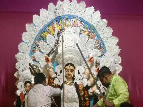 प्रयागराज. यूपी के प्रयागराज जिले में आज से दुर्गा पूजा शुरू हो गई है. कोरोना काल में दुर्गा पूजा में पहले के सालों की तरह रौनक नहीं देखी जा रही है. पहले जहां विशाल और कलात्मक पंडाल लगाकर मां दुर्गा की पूजा की जाती थी वहीं, अब इसे सीमित कर दिया गया है. यूपी में सबसे ज्यादा रामलीला और दुर्गा पूजा प्रयागराज में होती है, लेकिन सोशल डिस्टेंसिंग के नियमों ने पंडालों की चमक फीकी कर दी है. इस बार भी दुर्गा पूजा पंडाल सजे हैं, लेकिन कोविड-19 प्रोटोकॉल का पालन किया जा रहा है. सभी पंडालों में दुर्गा प्रतिमा की हाइट 5 फीट से कम रखी गई है. साथ ही आने जाने का मार्ग अलग-अलग है. अन्य प्रोटोकॉल लागू किए जा रहे हैं. उत्तर प्रदेश सरकार के प्रवक्ता और कैबिनेट मंत्री सिद्धार्थ नाथ सिंह गुरुवार को प्रयागराज पहुंचे. उन्होंने यहां दुर्गा पंडाल में जाकर वहां की व्यवस्थाओं को देखा. इस दौरान उन्होंने कोरोना काल के खात्मा की कामना की.