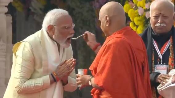 Ram Mandir Opening: अयोध्या में 22 जनवरी को राम मंदिर का उद्घाटन हो गया. रामलला की प्राण प्रतिष्ठा के साक्षी प्रधानमंत्री नरेंद्र मोदी बने. शंखनाद और मंत्रोच्चार के बीच रामलला गर्भगृह में विराजमान हुए. रामलला की प्राण प्रतिष्ठा शुभ मुहूर्त में संपन्न की गई. प्राण प्रतिष्ठा के बाद प्रधानमंत्री नरेंद्र मोदी का 11 दिनी विशेष अनुष्ठान भी पूरा हो गया. राम मंदिर परिसर में मंच पर मौजूद स्वामी गोविंद देव गिरी महाराज के हाथ से चरणामृत पीकर पीएम मोदी ने उपवास तोड़ा.
