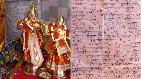 एक चिट्ठी रखी हुई मिलीमंगलवार को मंदिर के पास से ही गुजरने वाले दिल्ली हावड़ा सिक्स लेन हाईवे के नजदीक झाड़ियों के पास चोरी हुई मूर्ति और एक चिट्ठी रखी हुई मिली. मंदिर के पुजारी महंत जयराम दास पुलिस के साथ मौके पर पहुंचे तो वहां राधा कृष्ण की अष्टधातु की मूर्ति एक कपड़े में लिपटी हुई मिली. मूर्ति के साथ चिट्ठी की शक्ल में एक माफीनामा भी रखा हुआ था. यह माफीनामा चर्चा का सबब बना हुआ है.
