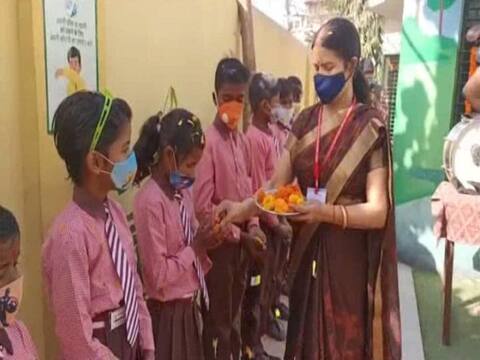 संगम नगरी प्रयागराज में भी आज करीब एक साल बाद पहली से पांचवी तक के स्कूल एक बार फिर से खुल गए हैं. प्रयागराज में आज पहले दिन बड़ी संख्या में बच्चे स्कूल पहुंचे. स्कूलों ने भी खास अंदाज में बच्चों का स्वागत व अभिनंदन किया और उनकी हौसला आफजाई करते हुए कोरोना के प्रति उनके डर को खत्म करने की कोशिश की. प्रयागराज में विद्या भारती द्वारा संचालित रानी रेवती देवी स्कूल में आज स्कूल खुलने पर बेहद खास इंतजाम किए गए थे. यहां स्कूल में दाखिल होते ही बच्चों को रंग बिरंगे गुब्बारे दिए गए थे. इसके साथ ही महिला टीचर्स बच्चों के माथे पर तिलक लगाकर उनका स्वागत कर रही थी तो साथ ही आरती के जरिए खास अंदाज में उनका अभिनंदन किया जा रहा था. स्कूल के टीचर्स ने बच्चों के स्वागत में एक खास गीत भी तैयार किया हुआ था. सुबह बच्चों की इंट्री के वक्त टीचर्स ने स्टूडेंट के साथ ही यह गीत गाकर खास अंदाज में समा बांधा.