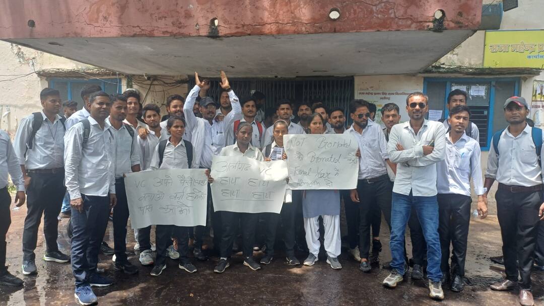 छात्रों ने वीसी पर लगाया आरोपवीसी साहब पैसे लेकर छात्रों को पास करते हैं. हम भी पैसा देने को तैयार हैं. हमें भी पास कर दीजिए. यह स्लोगन छात्रों के द्वारा अपनी पटिका पर लिखकर प्रदर्शन करते हुए नारेबाजी की है. छात्रों का कहना है, कुछ छात्र ऐसे हैं. जिनके द्वारा पैसे दिए गए. तब कहीं जाकर उन्हें पास किया गया. हम भी पैसे देने को तैयार है. लेकिन हमारे भविष्य को अंधकार से बचाया जाए. वहीं दूसरी ओर छात्रों का आरोप है, तीन दिन पहले जब आश्वासन दिया था तो वीसी साहब को कार्यालय में रहना था. लेकिन ऐसा नहीं किया गया. अब छात्र वीसी पर लापरवाही के आरोप लगा रहे हैं.